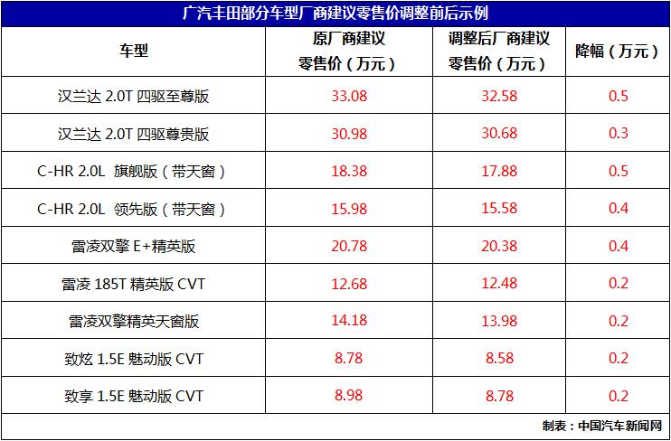 此次產(chǎn)品廠商建議零售價(jià)調(diào)整,涵蓋廣汽豐田旗下六大產(chǎn)品系列50個(gè)車(chē)型等級(jí),各車(chē)型調(diào)降幅度1000元-5000元,其中漢蘭達(dá)、C-HR最高調(diào)降5000元。全系車(chē)型涉及2萬(wàn)多個(gè)維修和保養(yǎng)零部件也同步進(jìn)行定期價(jià)格調(diào)整,部分零件最大降幅達(dá)20%。