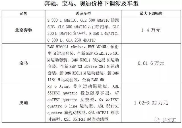 在奔馳官宣降價之后,寶馬和一汽-大眾奧迪也隨即跟進,宣布響應減稅降費號召,提前下調中國市場在售車型的廠商建議指導價。其中,寶馬中國市場在售車型最高下調6萬元,一汽-大眾奧迪中國市場在售車型最高下調3.32萬元。