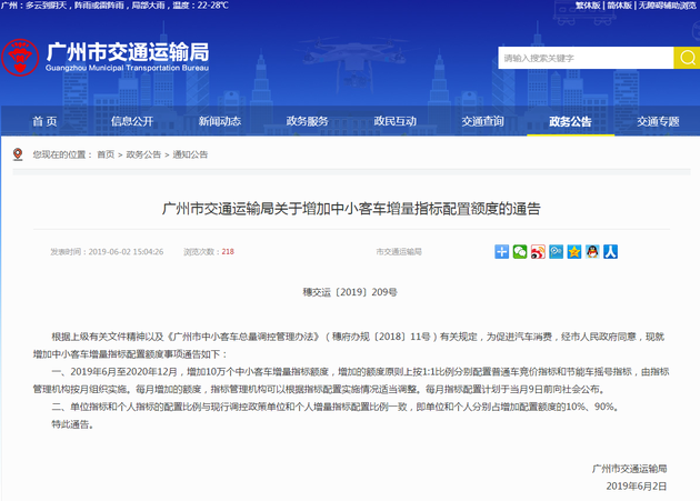 廣州市交通運(yùn)輸局關(guān)于增加中小客車增量指標(biāo)配置額度的通告