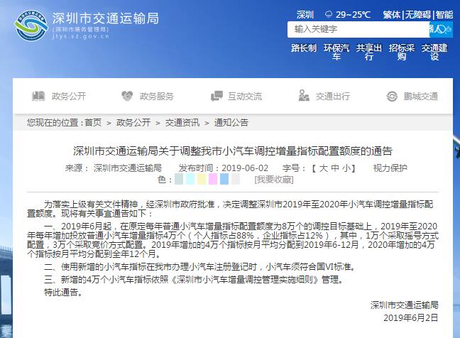 為落實(shí)上級(jí)有關(guān)文件精神,經(jīng)深圳市政府批準(zhǔn),決定調(diào)整深圳市2019年至2020年小汽車調(diào)控增量指標(biāo)配置額度?,F(xiàn)將有關(guān)事宜通告如下:
