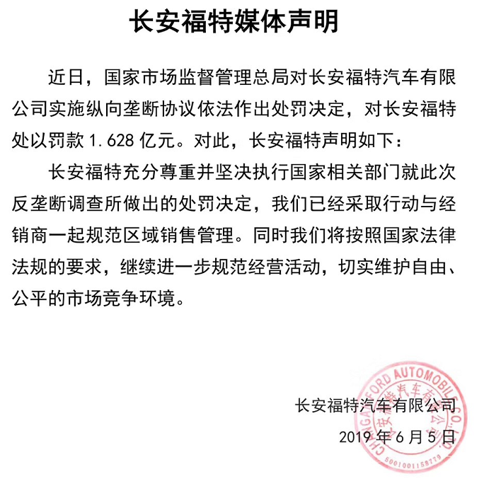 中國汽車新聞網(wǎng)訊 6月5日,國家市場監(jiān)督管理總局網(wǎng)站發(fā)布消息,對長安福特汽車有限公司實施縱向壟斷協(xié)議依法作出處罰決定,對長安福特處以罰款1.628億元。此處罰結(jié)果一經(jīng)公布,長安福特第一時間作出回應(yīng):“長安福特充分尊重并堅決執(zhí)行國家相關(guān)部門就此次反壟斷調(diào)查所做出的處罰決定,我們已經(jīng)采取行動與經(jīng)銷商一起規(guī)范區(qū)域銷售管理。同時我們將按照國家法律法規(guī)的要求,繼續(xù)進(jìn)一步規(guī)范經(jīng)營活動,切實維護(hù)自由、公平的市場競爭環(huán)境。”