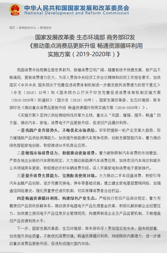 中國(guó)汽車(chē)新聞網(wǎng)訊 6月6日,國(guó)家發(fā)改委等三部門(mén)發(fā)布《推動(dòng)重點(diǎn)消費(fèi)品更新升級(jí) 暢通資源循環(huán)利用實(shí)施方案(2019-2020年)》,提出各地不得對(duì)新能源汽車(chē)實(shí)行限行、限購(gòu),已實(shí)行的應(yīng)當(dāng)取消。嚴(yán)禁各地出臺(tái)新的汽車(chē)限購(gòu)規(guī)定,已實(shí)施汽車(chē)限購(gòu)的地方政府應(yīng)根據(jù)城市交通擁堵、污染治理、交通需求管控效果,加快由限制購(gòu)買(mǎi)轉(zhuǎn)向引導(dǎo)使用。