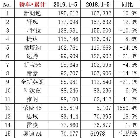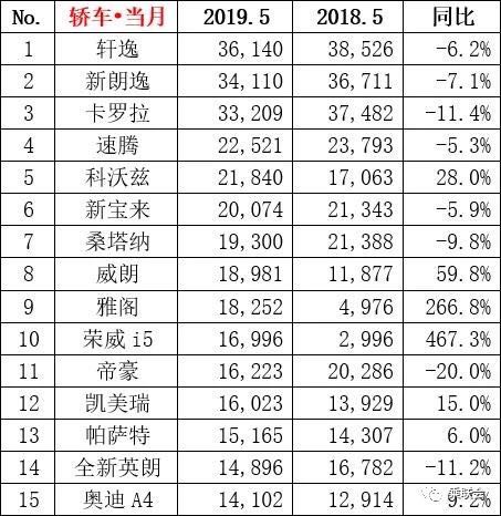 5月份排名轎車前十五名車型中,普遍處于下滑趨勢,其中帝豪同比下降20%,成為跌幅最大車型。榮威i5表現(xiàn)穩(wěn)健,成為前十名中唯一自主品牌車型。上汽通用兩款車型科沃茲與威朗表現(xiàn)突出,漲幅排在前列。