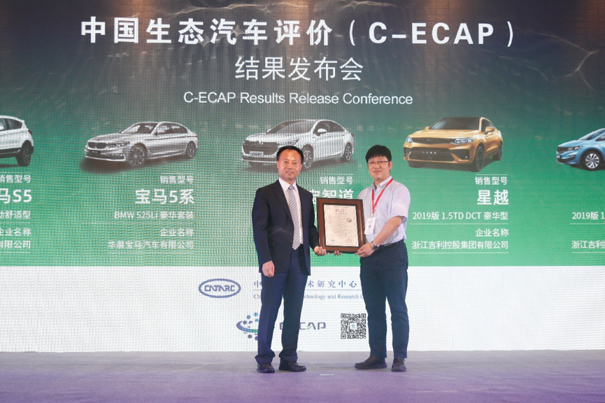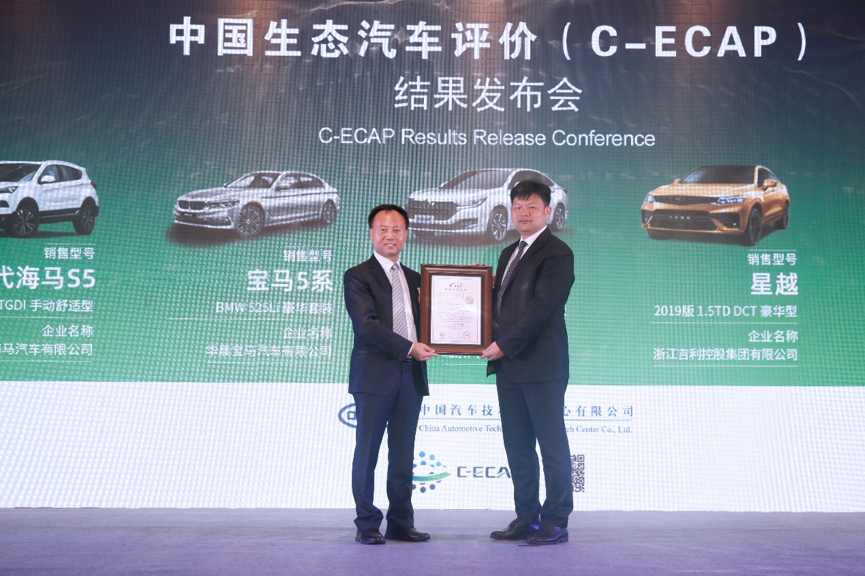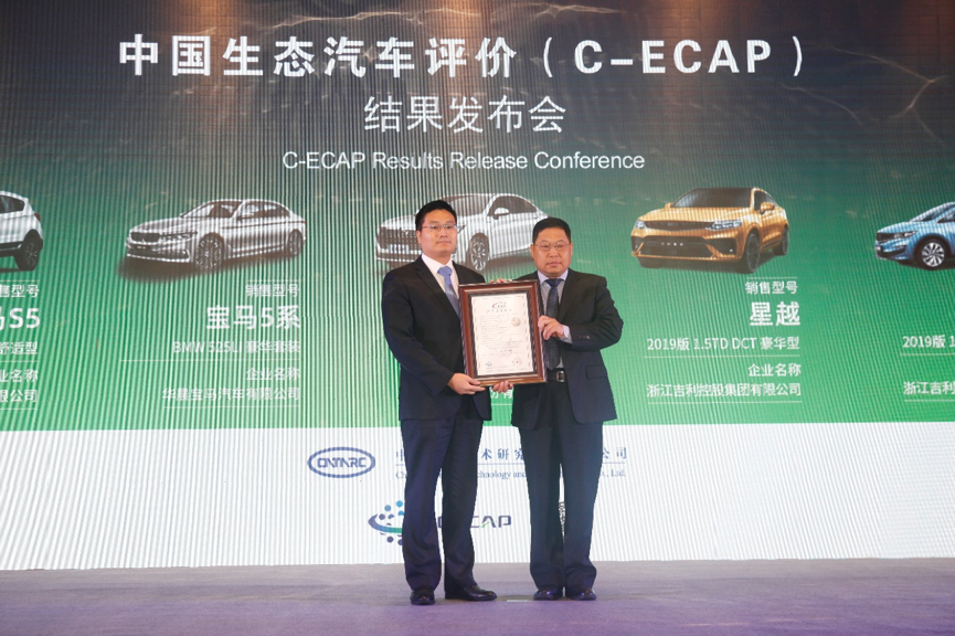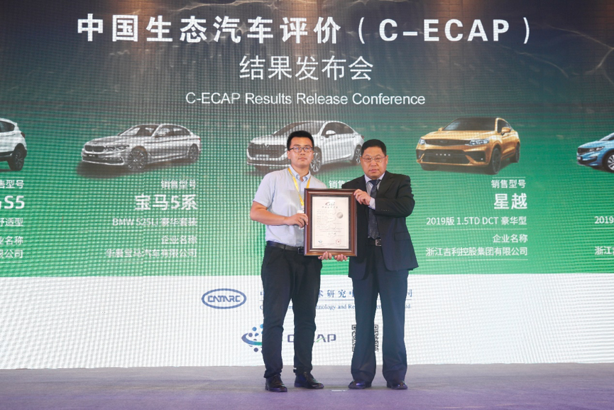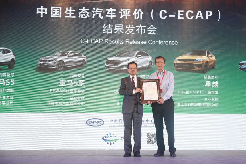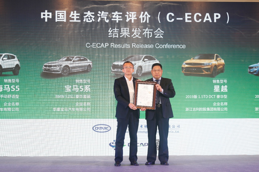 中汽中心檢測認(rèn)證事業(yè)部副總經(jīng)理、C-ECAP管理中心副主任 鄭元輝為浙江吉利控股集團(tuán)有限公司星越頒發(fā)認(rèn)證證書