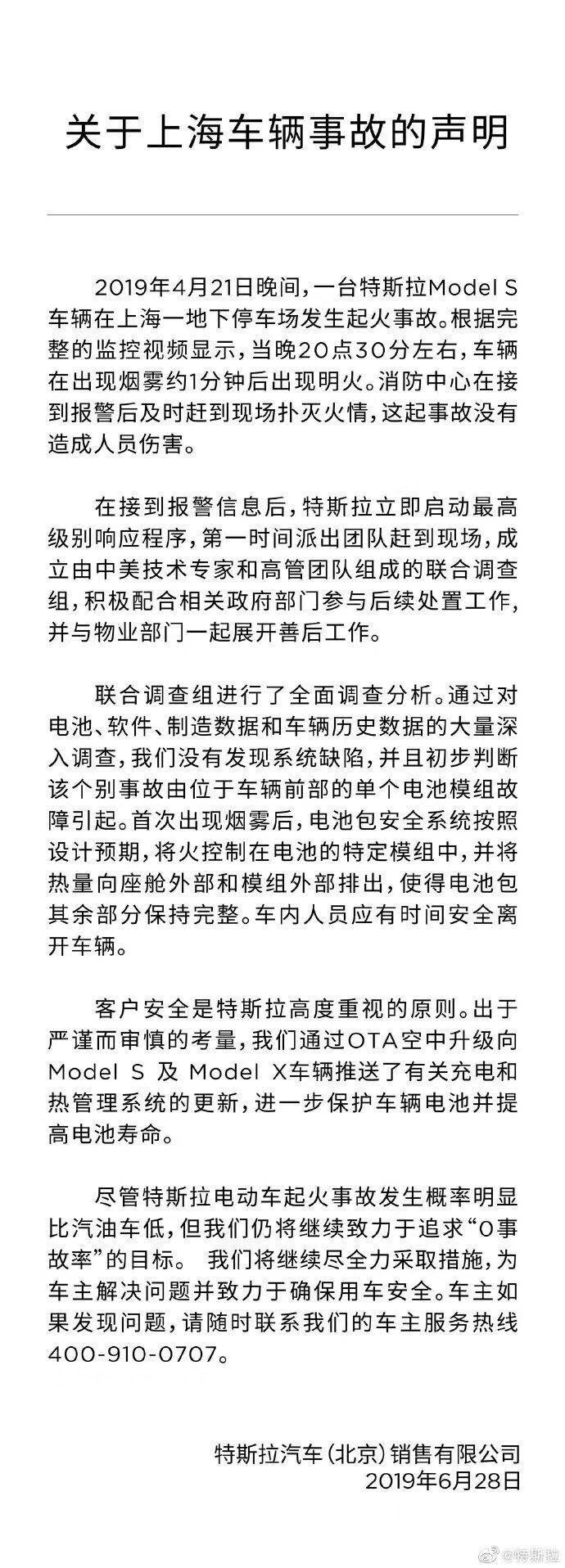 中國(guó)汽車新聞網(wǎng)訊 6月28日,特斯拉汽車(北京)銷售有限公司發(fā)布《關(guān)于上海車輛事故聲明》,聲明內(nèi)容主要針對(duì)今年4月21日晚間,一臺(tái)特斯拉Model S車輛在上海一地下停車場(chǎng)發(fā)生起火事故原因調(diào)結(jié)果。聲明表示,通過(guò)對(duì)電池、軟件、制造數(shù)據(jù)和車輛歷史數(shù)據(jù)的大量深入調(diào)查,沒(méi)有發(fā)現(xiàn)系統(tǒng)缺陷,并初步判斷該個(gè)別事故由位于車輛前部的單個(gè)電池模塊組故障引起。