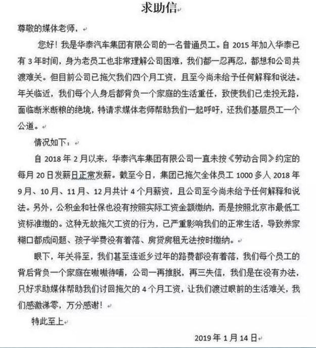 其實早在今年1月,就有華泰汽車內(nèi)部員工發(fā)出的一封《求助信》,信中內(nèi)容稱華泰汽車已經(jīng)連續(xù)數(shù)月沒有按時發(fā)放工資,拖欠基層員工薪資數(shù)百萬,另外,公積金和社保也沒有按照實際工資金額繳納,而是按照北京市最低工資標準繳的。此事將華泰汽車直接推到了風(fēng)口浪尖。
