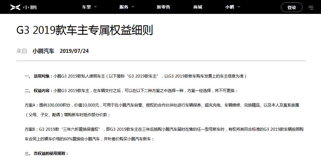 選擇方案 B 的 G3 2019 款車主,小鵬汽車將同車主簽訂電子協(xié)議;同時對于車機綁定人和合同簽署人一致的車主,小鵬汽車也將推送一張三年 6 折保值置換的電子憑證至車主的車機綁定賬戶;小鵬 G3 2019 款車主行使此置換權益時,須提供電子協(xié)議或電子憑證,以及車輛的購車合同、購車發(fā)票、行駛證。同時,置換權力也可以隨車轉讓。