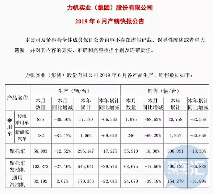 隨著新能源補貼退坡等不利形勢,力帆新能源汽車的銷量更為嚴(yán)峻,今年前6個月累計售出1257輛,同比下滑60.66%。