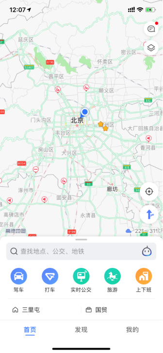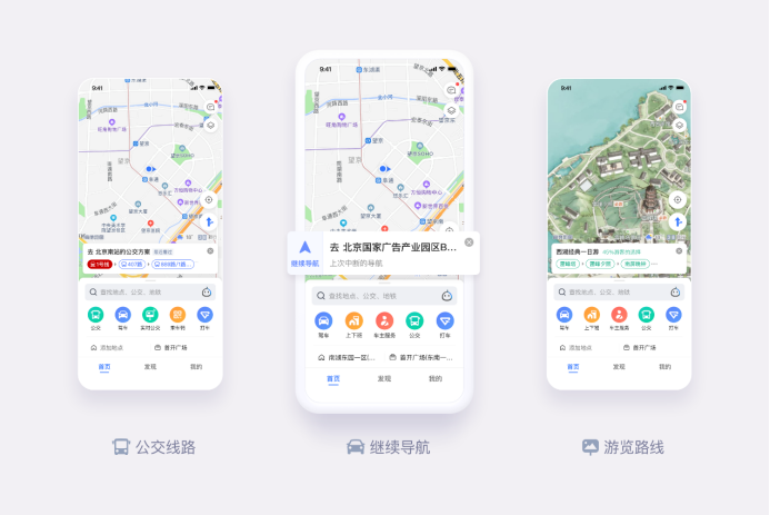 產(chǎn)品架構(gòu)更清晰。V10.0新版的整體信息架構(gòu)調(diào)整為:首頁、發(fā)現(xiàn)、我的。“首頁”主要幫助用戶更快地完成“我在哪”、“怎么去”、“用工具”等一系列出行服務(wù);“發(fā)現(xiàn)”幫助用戶探索基于地理位置的興趣點,解決的是“去哪兒”的問題。