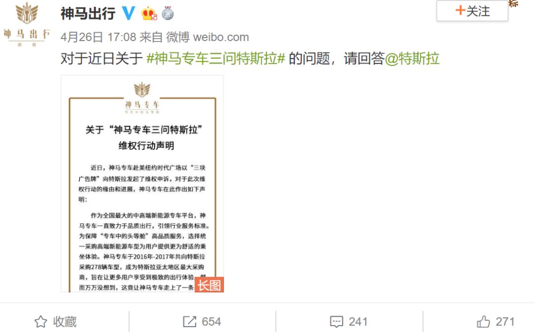 隨后神馬專車發(fā)布維權(quán)行動聲明,要求特斯拉道歉,同時賠償損失650萬元。