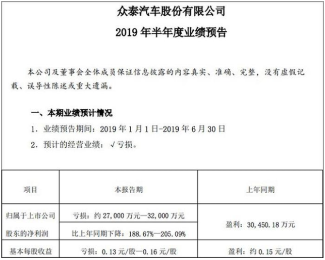 種種跡象表明,眾泰汽車(chē)正陷入困境。8月19日晚,眾泰汽車(chē)(000980)披露半年度業(yè)績(jī)預(yù)告稱(chēng),公司預(yù)計(jì)上半年虧損約2.7億元至3.2億元,而在2018年上半年同期,其凈利潤(rùn)為盈利3.05億元。眾泰汽車(chē)稱(chēng),預(yù)計(jì)凈利虧損原因?yàn)槭芎暧^(guān)經(jīng)濟(jì)形勢(shì)的影響,汽車(chē)行業(yè)整體景氣度不高,眾泰汽車(chē)銷(xiāo)量下降,導(dǎo)致公司半年度業(yè)績(jī)同比有較大幅度下降。