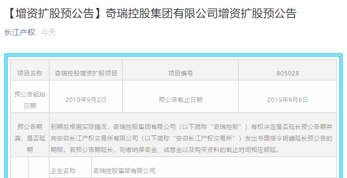中國汽車新聞網(wǎng)訊 9月2日,奇瑞汽車股份有限公司(下稱“奇瑞股份”)和奇瑞控股集團有限公司(下稱“奇瑞控股”)雙雙在長江產(chǎn)權交易所發(fā)布了增資擴股預公告,結束日期為2019年9月6日。