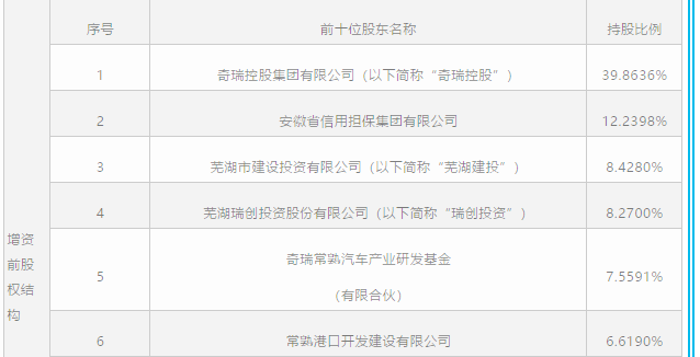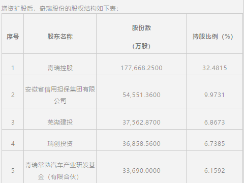 目前,奇瑞控股集團第一大股東為蕪湖市建設投資有限公司(下稱“蕪湖建投”),而在增資擴股完成后,蕪湖建投持股比例將從此前的40.1084%下降至27.68%,新資方的持股比例達到30.99%,將成為奇瑞控股集團的第一大股東。完成增資擴股后,奇瑞控股仍將是奇瑞股份的第一大股東,持股比例為32.4815%。不過,隨著奇瑞控股集團大股東的易主,奇瑞股份的大股東也將隨之易主。