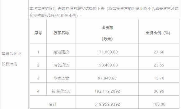 公告顯示,奇瑞股份的增資底價為681,572萬元,對應持股比例為18.5185%;奇瑞控股的增資底價為753,387萬元,對應持股比例為30.99%。