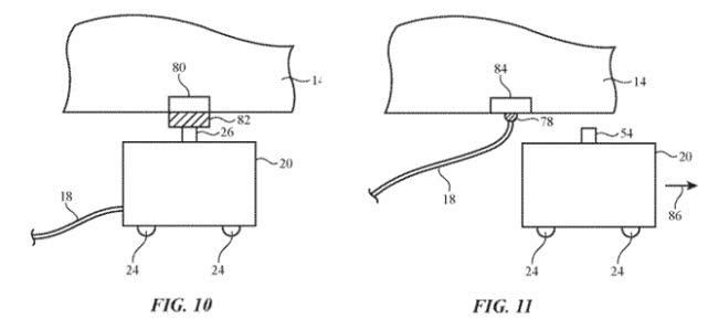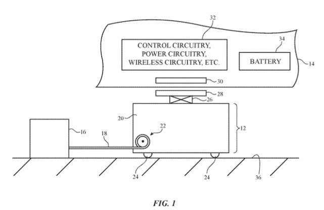 專利顯示,該設(shè)備可以攜帶用于傳輸電力的物理連接電源線,或者可以使用基于線圈的無(wú)線充電系統(tǒng)。該裝置還可以通過(guò)電動(dòng)機(jī)和車(chē)輪自行移動(dòng),并配有檢測(cè)系統(tǒng),可以避免地板上的任何障礙物。