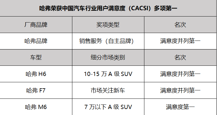 在本次評選中,哈弗從參與評選的60個汽車品牌中脫穎而出,斬獲銷售服務滿意度獎項第一名。其中,在187款車型評選出的“各品牌車型用戶滿意度測評結果”獎項中,哈弗H6再度加冕“10-15萬A級SUV”王者桂冠,哈弗F7榮獲“市場關注新車”第一名,哈弗M6則登頂“7萬以下A級SUV”第一寶座。
