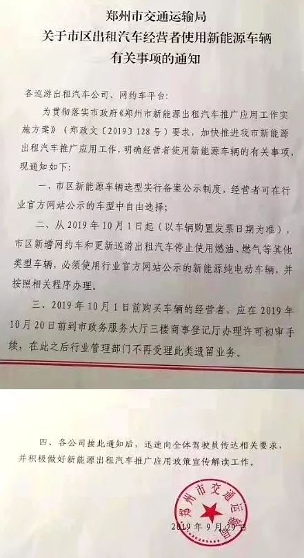 通知內(nèi)容顯示,自2019年10月1日起,鄭州市市區(qū)新增網(wǎng)約車和更新巡游出租車停止使用燃油、燃?xì)獾绕渌愋蛙囕v,必須使用行業(yè)官方網(wǎng)站公示的新能源純電動(dòng)車輛。