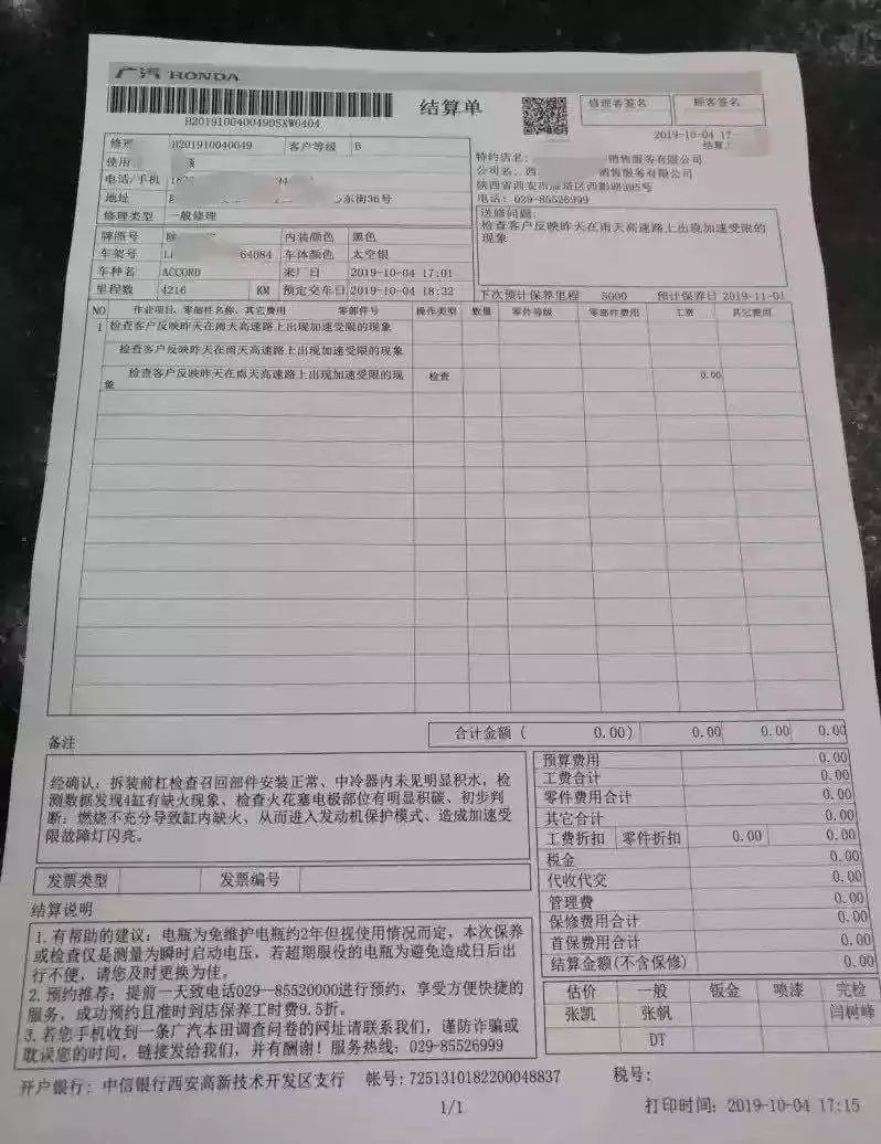 車主稱,其購(gòu)買的1.5T汽油版十代雅閣于2019年5月3日提車,8月23日做車輛首保時(shí)同時(shí)也做了失速門的召回,10月3日發(fā)生失速事件時(shí)里程是4000多公里。
