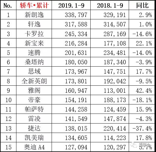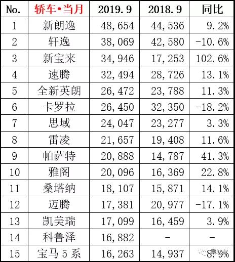 9月份轎車銷量85.9萬輛,同比下降11.2%,環(huán)比增長(zhǎng)13.2%;從具體車型來看,大眾系車型表現(xiàn)最為搶眼。新朗逸接近5萬輛的月銷量,也創(chuàng)造今年轎車月銷量新高,新寶來更是實(shí)現(xiàn)同比102.6%的翻番增長(zhǎng)。而且排名前15位轎車中,只有三款車型同比負(fù)增長(zhǎng),形勢(shì)一片大好。但是可惜中國(guó)品牌轎車在9月份表現(xiàn)不佳,無一款車型進(jìn)榜。