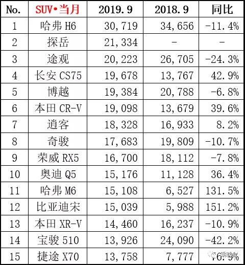 SUV排名:探岳越戰(zhàn)越勇 中國(guó)品牌占半壁江山
