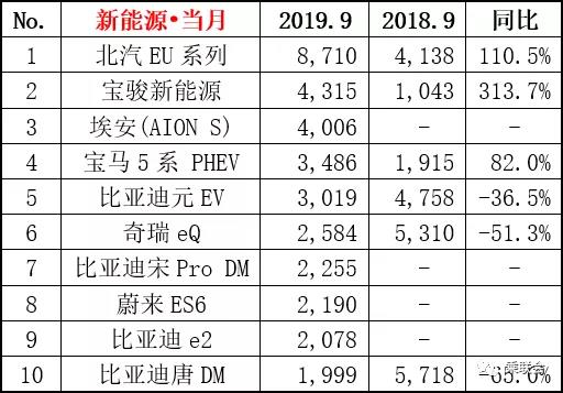 9月份新能源狹義乘用車銷量6.1萬輛,同比下降34.8%,環(huán)比下降4.2%。新能源也成為9月份唯一一個(gè)同比與環(huán)比雙降的細(xì)分市場(chǎng)。具體車型方面,各地網(wǎng)約車和出租車更換,為北汽EU系列車型銷量提供穩(wěn)定保證,銷量方面遙遙領(lǐng)先。廣汽新能源新車型Aion S已邁上月銷4000輛新臺(tái)階,在個(gè)人消費(fèi)市場(chǎng)大獲成功。作為造車新勢(shì)力,蔚來ES6月銷2336輛,看到了新希望。