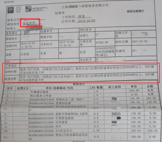 10月9日,4S店為方先生開具的該車維修工單,并未見到維修技師所描述的需要更換“油門控制的某部件”字樣