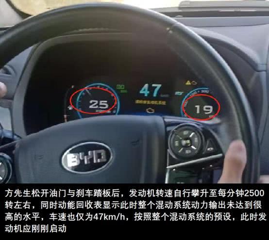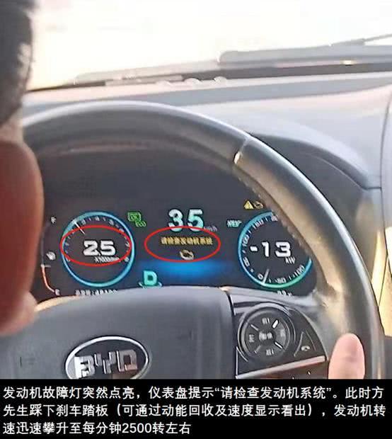 休息片刻,我們決定再次啟動車輛。隨后,更加驚險的一幕出現(xiàn)了——當(dāng)方先生再次啟動車輛后,儀表盤報警信息如故。此時方先生沒有踩踏任何踏板,車輛開始自動加速上升至60km/h,發(fā)動機(jī)轉(zhuǎn)速也由每分鐘1200轉(zhuǎn)左右迅速攀升至每分鐘2300轉(zhuǎn)左右,同時伴有巨大的發(fā)動機(jī)轟鳴聲。此時,方先生重重踩下剎車踏板,發(fā)動機(jī)轉(zhuǎn)速繼續(xù)攀升至每分鐘2500轉(zhuǎn)左右,車速從60km/h略有下降。而當(dāng)方先生松開剎車踏板,也并未有任何踩踏(油門或剎車)動作時,車速又開始持續(xù)攀升。方先生多次點剎后,才使車速回到40km/h以下。此時,車輛切換為EV純電模式后發(fā)動機(jī)關(guān)閉。車輛停穩(wěn)后,方先生表示這種“自動加速”現(xiàn)象才是這輛車失控問題的核心,他上網(wǎng)查到比亞迪車輛出現(xiàn)這種現(xiàn)象不只他一個,此時他真的害怕了!“這車就像一頭牛,一旦瘋起來就很難控制……”方先生帶著顫音說。