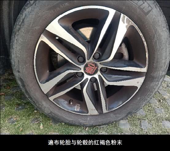 車輛停穩(wěn)后,我們下車觀察該車四個輪轂與輪胎上附著大量紅褐色粉末,這引起了我們的注意。經(jīng)過仔細(xì)查看,這樣的粉末在剎車卡鉗上附著得更多。這種現(xiàn)象是如何導(dǎo)致的?是否預(yù)示著在剛剛行駛過程中,制動力、牽引力的同時作用給剎車系統(tǒng)帶來的異常磨損?更進(jìn)一步的判斷還需要專家用技術(shù)手段來證實。