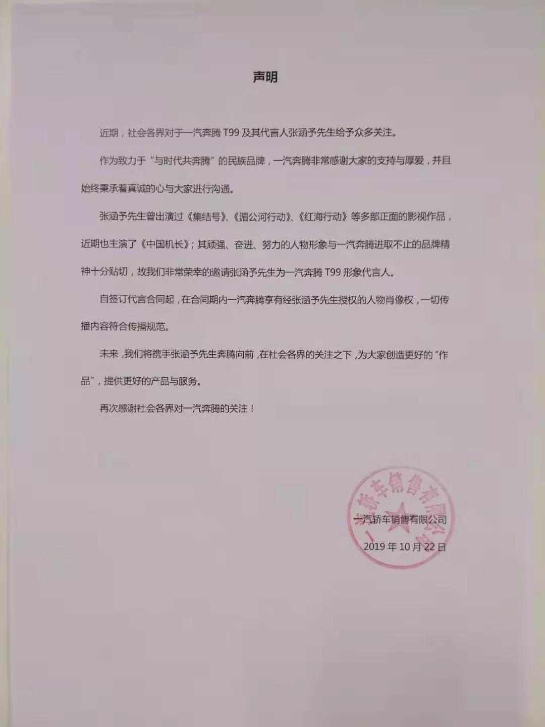 10月22日,一汽轎車銷售有限公司也發(fā)布蓋章聲明。聲明中寫到:近期,社會各界對于一汽奔騰T99及其代言人張涵予先生給予眾多關(guān)注。作為致力于“與時代共奔騰”的民族品牌,一汽奔騰非常感謝大家的支持與厚愛,并且始終秉承著真誠的心與大家進行溝通。