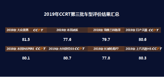 本批次評價涵蓋了緊湊型轎車、中大型轎車、緊湊型SUV三類汽車的8款熱門車型,從整體結(jié)果看,綜合得分80分及以上車型共計(jì)5款,成為2019年度CCRT推薦車型,80分以下車型共計(jì)3款。各車型具體得分如下: