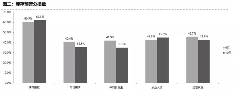 而從分指數(shù)看,調(diào)查顯示,10月庫存指數(shù)62.3%,環(huán)比上升1.8個(gè)百分點(diǎn);從業(yè)人員指數(shù)45.0%,環(huán)比上升2.2個(gè)百分點(diǎn);市場需求指數(shù)、平均日銷量指數(shù)、經(jīng)營狀況指數(shù)均環(huán)比下降。
