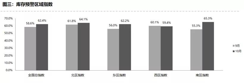 從區(qū)域指數(shù)情況看:調(diào)查顯示,10月份全國總指數(shù)為62.4%,北區(qū)指數(shù)為64.1%,東區(qū)指數(shù)為62.2%,南區(qū)指數(shù)為65.3%,西區(qū)指數(shù)為59.4%。