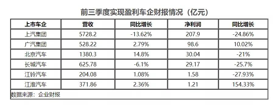 北京汽車和江鈴汽車前三季度均呈現(xiàn)營收增長、利潤出現(xiàn)超20%下滑的局面。