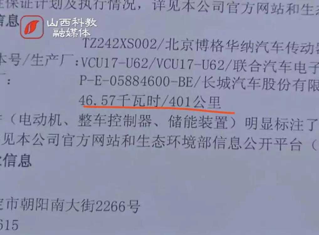 根據(jù)李先生提供的車輛隨車清單顯示,該車輛長(zhǎng)城歐拉IQ車型,電池容量為46.57千瓦時(shí),續(xù)航里程為401公里,可現(xiàn)如今車輛巡航里程卻縮水一半。
