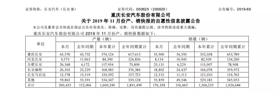 據(jù)銷量數(shù)據(jù)顯示,今年11月長安汽車銷量為176358輛,同比增長12.57%;1-11月長安汽車?yán)塾?jì)銷量為1566,255輛,同比下降18.71%。其中,重慶長安、河北長安和合肥長安三家子公司累計(jì)銷量為749984輛,較去年同期的866897輛同比減少13.4%;長安福特1-11月累計(jì)銷量為166078輛,較去年同期的359972輛同比減少53.9%;長安馬自達(dá)1-11月累計(jì)銷量為121010輛,較去年同期的154762輛同比減少21.8%。