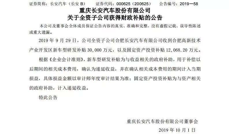 12月18日,長安汽車發(fā)布公告稱,重慶長安汽車股份有限公司(下稱”公司“)收到重慶市江北區(qū)財(cái)政國庫支付中心2019年工業(yè)和信息化專項(xiàng)資金3000萬元,激勵研發(fā)投入資金4225萬元,合計(jì)7225 萬元。