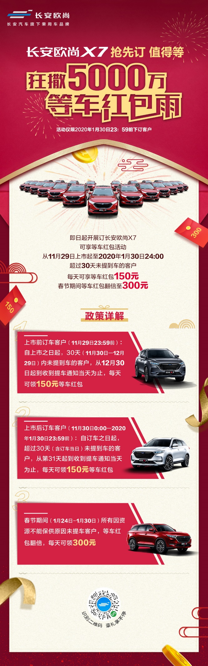 發(fā)布會上,長安歐尚汽車宣布,仍鄭重向客戶履行30天交車服務(wù),對未能按時提車和家境訂車的客戶推出“5000萬等車紅包計劃”。包括:上市前訂車客戶,自上市之日起,30天內(nèi)未提到車的客戶,從12月30日起,每天150元等車紅包;上市后訂車客戶,自訂車之日起,超過30天未提到車客戶享受150元/天訂車紅包;春節(jié)期間所有未提車客戶及訂車客戶,直領(lǐng)2100元等車紅包。