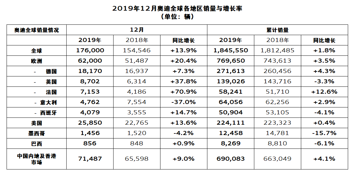 受眾多政治與經(jīng)濟不確定因素、車型更新?lián)Q代、全球輕型車測試規(guī)程(WLTP)的實施等因素影響,奧迪2019年在歐洲市場的銷量受到不利影響。2019年,奧迪所有車型在歐洲本土市場的銷量約為769,650輛,同比增長3.5%。受2018年的銷量基數(shù)影響,2019年最后一個季度的銷量取得顯著增長。全新奧迪Q3助推了銷量的增長,銷量達到93,900輛,同比增長55.5%。奧迪e-tron深受歐洲客戶的青睞,銷量約為19,550輛,其中超過四分之一的銷量來自挪威。在德國市場,奧迪2019年銷量為271,613輛車,同比增長4.3%。