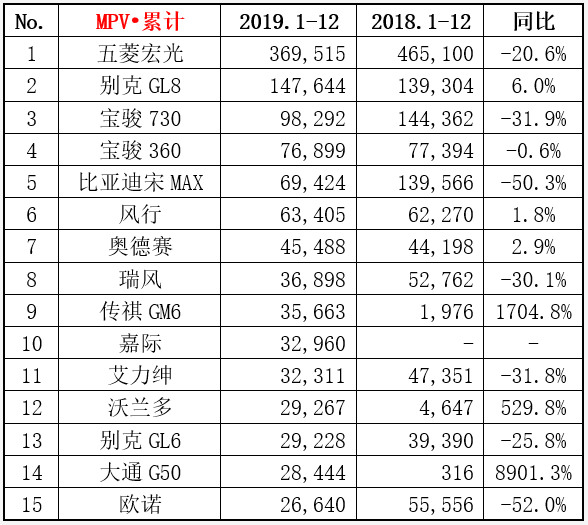 2019年全年MPV銷量累計排名前三的車型分別為五菱宏光、別克GL8、寶駿730。其中五菱宏光全年累計銷量為369515臺,相比去年同比減少20.6%,別克GL8車型全年銷量為147644臺,相比去年同比增長6.0%,寶駿730車型全年銷量為98296臺,相比去年同比減少31.9%。