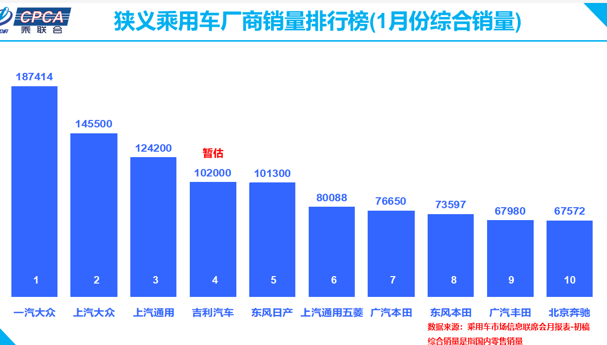 在廠商銷量方面,一汽-大眾、上汽大眾、上汽通用三大品牌穩(wěn)居1月份車企銷量前三。其中,一汽-大眾在銷量上領(lǐng)先上汽大眾4.2萬臺。