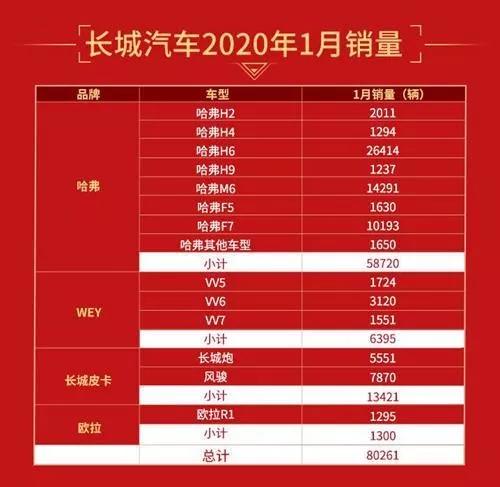 其中,銷售主力的哈弗品牌1月累計(jì)銷量58720輛,同比下降31.8%,H6、M6和F7依舊是哈弗走量車型。高端品牌WEY在1月的銷量為6395輛,同比下降37%,四款車型均出現(xiàn)低迷的市場(chǎng)表現(xiàn)。歐拉品牌則銳減至1300輛,新能源領(lǐng)域遇冷。而長(zhǎng)城炮皮卡的市場(chǎng)表現(xiàn)尚可,1月銷量為5551臺(tái)。