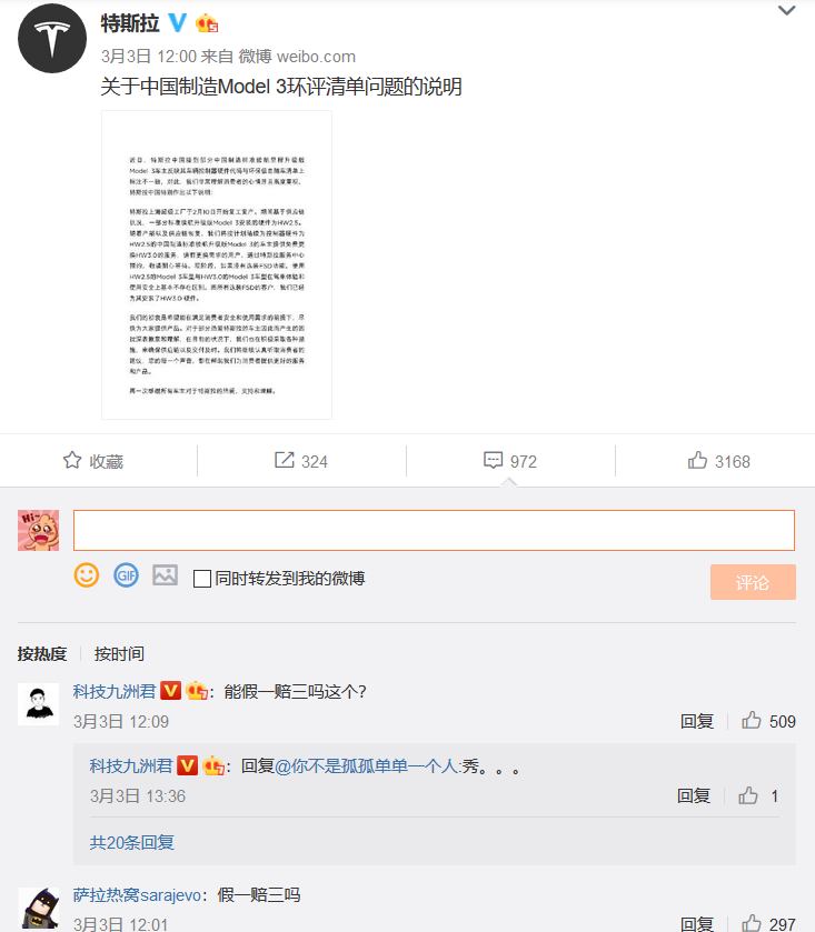 3月1日,多位車主在網(wǎng)上曝光稱,國產(chǎn)Model3 搭載的自動(dòng)駕駛配置與隨車環(huán)保清單上的標(biāo)注不符,車輛控制器硬件由HW3.0換裝成HW2.5,存在貨不對板和減配降級(jí)的情況。芯片減配事件被曝光后,多名車主在特斯拉車主群、汽車論壇、電動(dòng)汽車博主等參與討論,質(zhì)疑特斯拉在消費(fèi)者不知情的情況下擅自減配。