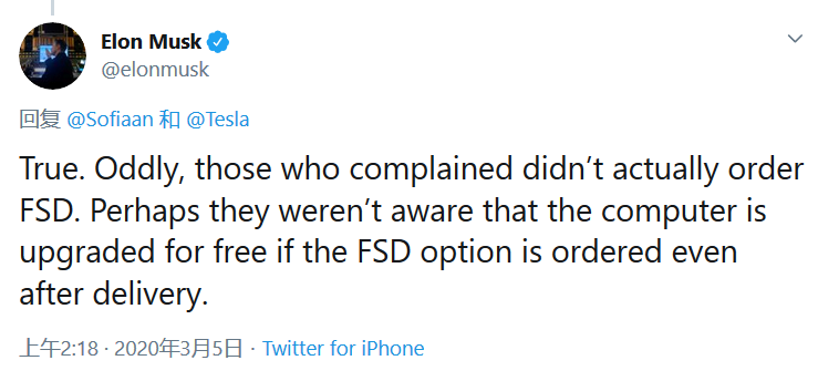 值得一提的是,有粉絲在推特上表示“特斯拉交付HW2.5的新車并不是什么大事”,隨后,特斯拉CEO馬斯克留言表示“那些抱怨的人實(shí)際上并沒有選裝FSD功能,如果選裝了FSD功能,特斯拉會(huì)為他們免費(fèi)升級(jí)為HW3.0芯片”,暗諷中國消費(fèi)者“無理取鬧”。