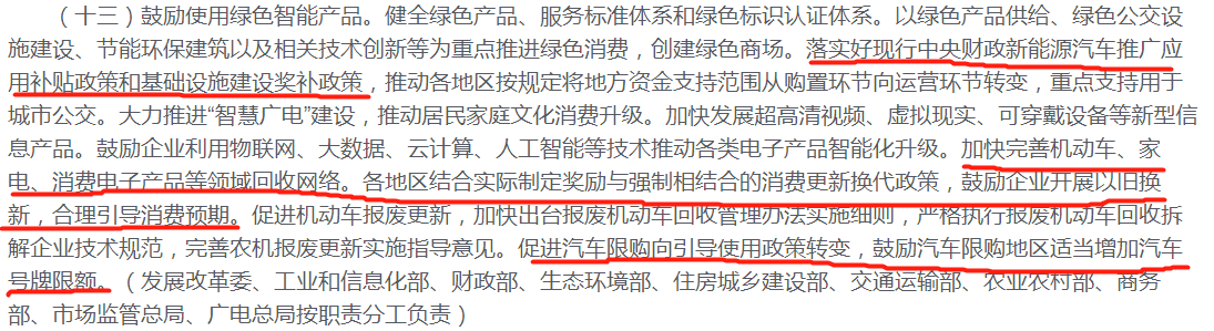 《意見》要求,加快完善機(jī)動(dòng)車、家電、消費(fèi)電子產(chǎn)品等領(lǐng)域回收網(wǎng)絡(luò)。各地區(qū)結(jié)合實(shí)際制定獎(jiǎng)勵(lì)與強(qiáng)制相結(jié)合的消費(fèi)更新?lián)Q代政策,鼓勵(lì)企業(yè)開展以舊換新,合理引導(dǎo)消費(fèi)預(yù)期。促進(jìn)機(jī)動(dòng)車報(bào)廢更新,加快出臺(tái)報(bào)廢機(jī)動(dòng)車回收管理辦法實(shí)施細(xì)則,嚴(yán)格執(zhí)行報(bào)廢機(jī)動(dòng)車回收拆解企業(yè)技術(shù)規(guī)范,完善農(nóng)機(jī)報(bào)廢更新實(shí)施指導(dǎo)意見。促進(jìn)汽車限購(gòu)向引導(dǎo)使用政策轉(zhuǎn)變,鼓勵(lì)汽車限購(gòu)地區(qū)適當(dāng)增加汽車號(hào)牌限額。