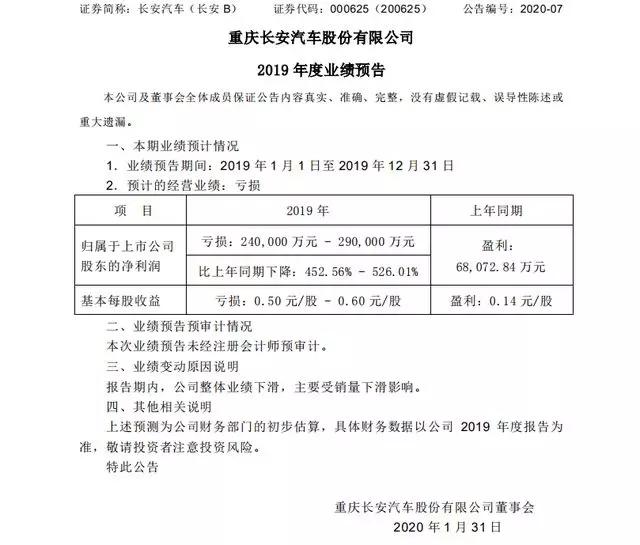 銷量下滑所引發(fā)的連鎖反應,則是利潤的縮水。日前,長安汽車(SZ000625)發(fā)布了2019年度業(yè)績預告,歸屬于上市公司股東的凈利潤預計虧損24-29億元,比去年同期盈利6.8億元的數(shù)據(jù)下降了452.56%-526.01%。