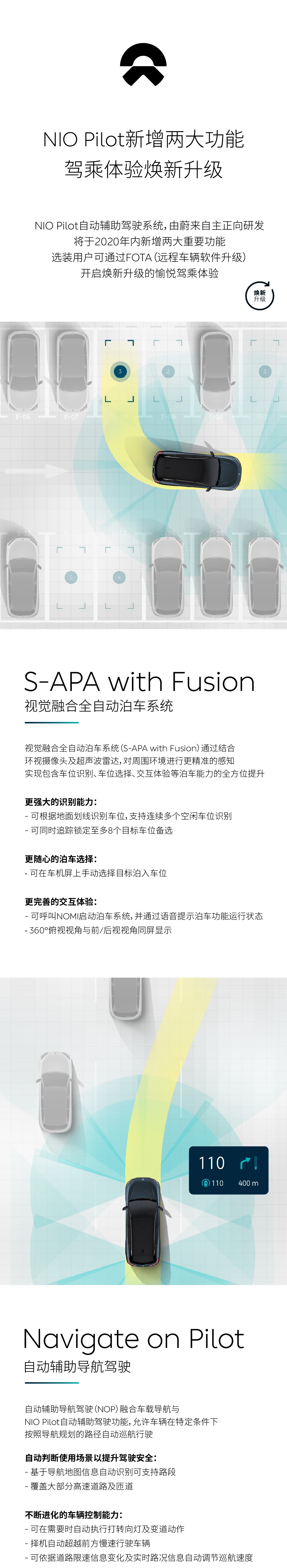 中國汽車新聞網(wǎng)訊 4月1日,我們從官方渠道獲悉, 蔚來正向研發(fā)的自動輔助駕駛系統(tǒng)NIO Pilot將在2020年新增兩大重要功能:自動輔助導(dǎo)航駕駛(NOP)和視覺融合全自動泊車系統(tǒng)(S-APA with Fusion)。