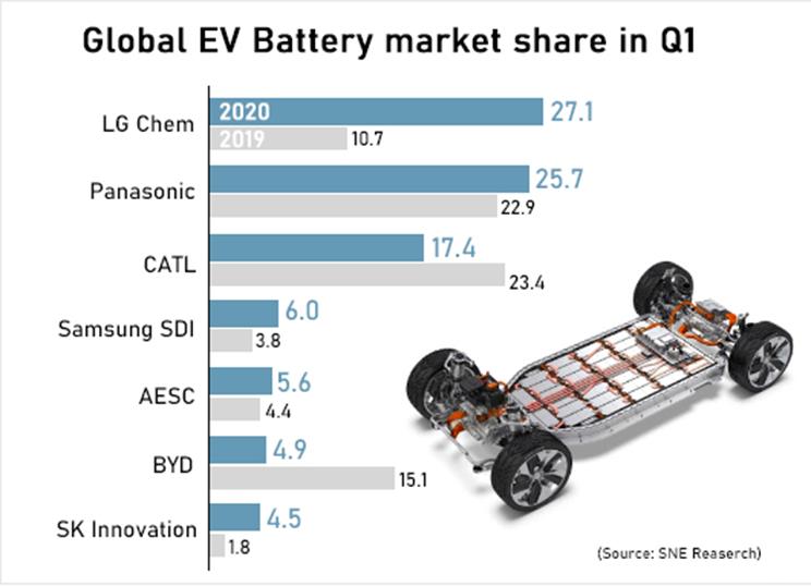 調(diào)研機(jī)構(gòu)SNEResearch的最新報(bào)告顯示,2020年第一季度全球電動(dòng)車(EV)電池的使用量中,LG化學(xué)以27.1%的市場(chǎng)占有率排名第一。