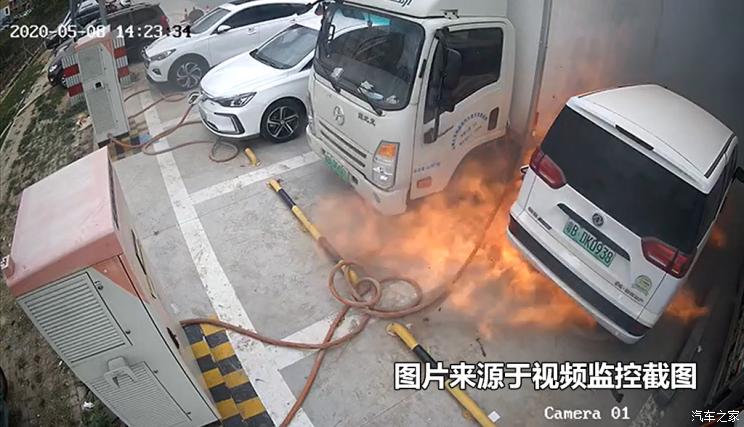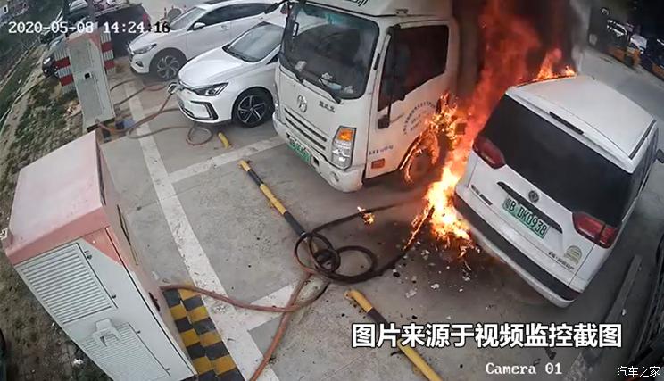根據(jù)監(jiān)控視頻中的信息顯示,2020年5月8日14時(shí)23分左右,一輛帥客EV停放在充電站內(nèi),充電槍與車輛處于連接狀態(tài),是否正在充電尚不明確。起初,視頻中出現(xiàn)類似于燃放鞭炮時(shí)的噪音,隨后該車車底冒出滾滾濃煙,之后車底發(fā)生爆炸,然后有火焰噴射而出,隨即火勢(shì)開(kāi)始蔓延。