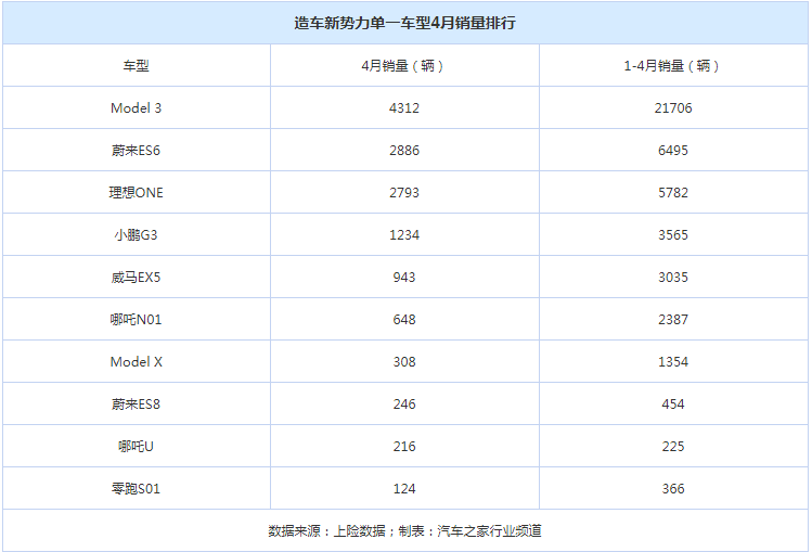 如果在中國獨(dú)資的特斯拉也稱得上“新勢力”的話,特斯拉Model 3則為造車新勢力單一車型銷量第一名,其銷量達(dá)4312輛;由于特斯拉近期頻繁調(diào)價(jià)造成用戶持幣觀望,其4月上險(xiǎn)數(shù)據(jù)環(huán)比3月大幅下滑63.8%。即便如此,特斯拉的單一車型銷量表現(xiàn)仍一騎絕塵,可見,我國新創(chuàng)車企在打造爆款車型方面仍有很長的路要走。