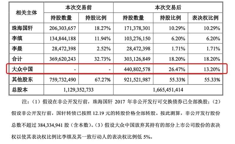 協(xié)議簽署后,大眾中國將合計持有公司4.408億股,占總股本的26.47%,為國軒高科第一大股東。李縝及其一致行動人將合計持有公司3.03億股,占公司總股本的18.20%,為公司第二大股東。